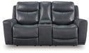 Prepare to be moved. This power reclining loveseat with console combines sleek modern design with all the soothing features you've been dreaming of. Wrapped in blue-hued leather and faux leather for affordable luxury, this highly contemporary piece with cozy scoop seating suits your relaxed vibe. Infinite reclining and headrest positions are yours at the touch of a button. It's the perfect choice for anyone who wants their comfort with a side of style.