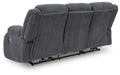 There's no need to sacrifice looks for comfort—this power reclining sofa with drop-down table serves up both, plus a richly relaxed sense of style. Its steel-hued velvet upholstery is ultra soft, with a plush waffle weave for an added layer of interest. The overstuffed pillow top armrests are custom made for lazy afternoon catnaps. A one-touch power control takes the pleasure of reclining to a higher level, while cup holders and USB charging help keep essentials close by.