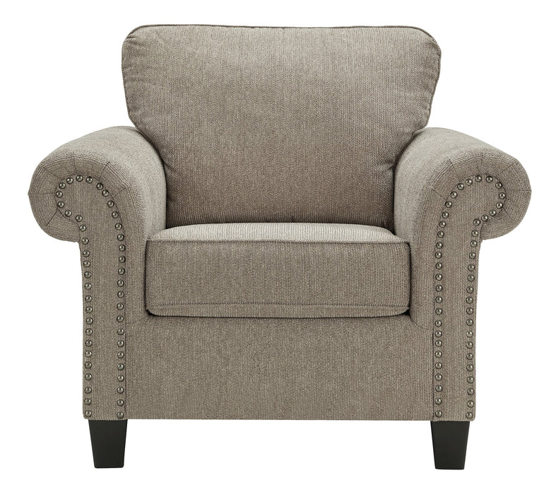 Sporting traditional elements including roll arms with nailhead trim, this chair gives here-and-now relevance to a classic style. The lovely pewter shade of the textured chenille upholstery brings a relaxed sensibility. Mix in contrasting tapered legs for a striking look you're sure to love for years to come.