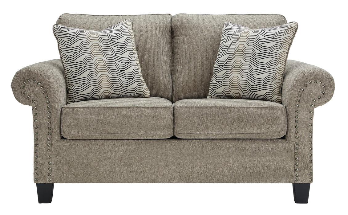 Sporting traditional elements including roll arms with nailhead trim, this loveseat gives here-and-now relevance to a classic style. The lovely pewter shade of the textured chenille upholstery brings a relaxed sensibility. Mix in contrasting tapered legs for a striking look you're sure to love for years to come.