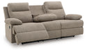 Fully upright or completely stretched out, this traditional-inspired reclining sofa caters to the art of relaxation. Super soft mocha-colored upholstery and sumptuous cushioning—made all the more indulgent with pillow top arms—cradles you in comfort from head to toe. A middle seat with a drop-down table, cup holders and USB charging takes comfort and convenience to another level.