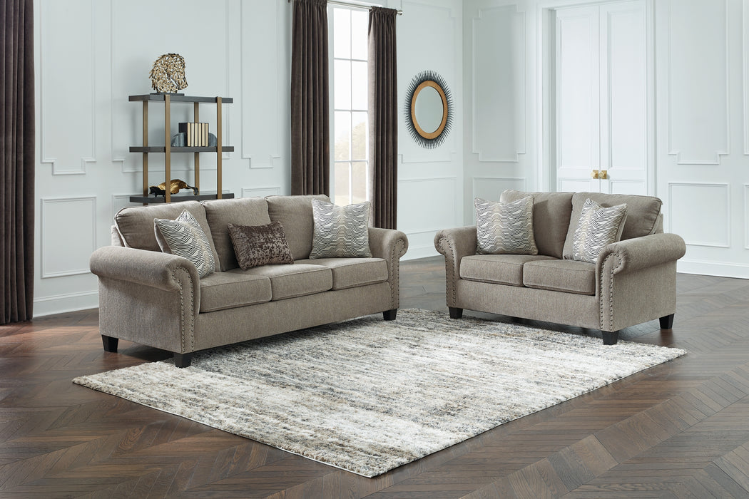 Details Includes sofa and loveseat, Corner-blocked frame, Attached backs and loose seat cushions, High-resiliency foam cushions wrapped in thick poly fiber, Accent pillows included, Pillows with soft polyfill, Polyester chenille upholstery, Black nickel-tone nailhead trim, Exposed feet with faux wood finish, Platform foundation system resists sagging 3x better than spring system after 20,000 testing cycles by providing more even support, Smooth platform foundation maintains tight, wrinkle-free look without dips or sags that can occur over time with sinuous spring foundations