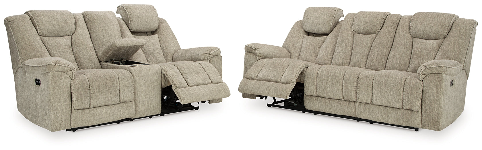 Details Includes power sofa and power loveseat with console, Sofa with dual-sided recliner; middle seat remains stationary, Loveseat with center console with 2 cup holders and hidden storage, One-touch power control with adjustable positions, Easy View™ adjustable headrest and zero-draw USB port, Zero-draw technology only consumes power when the USB receptacle is in use, Zero-gravity mechanism allows optimum reclining comfort with infinite reclining positions at the touch of a button, Corner-blocked frame with metal reinforced seat, Attached cushions, High-resiliency foam cushions wrapped in thick poly fiber, Polyester upholstery, Extended ottoman for enhanced comfort, Ambient blue LED backlight, Power cord included; UL Listed