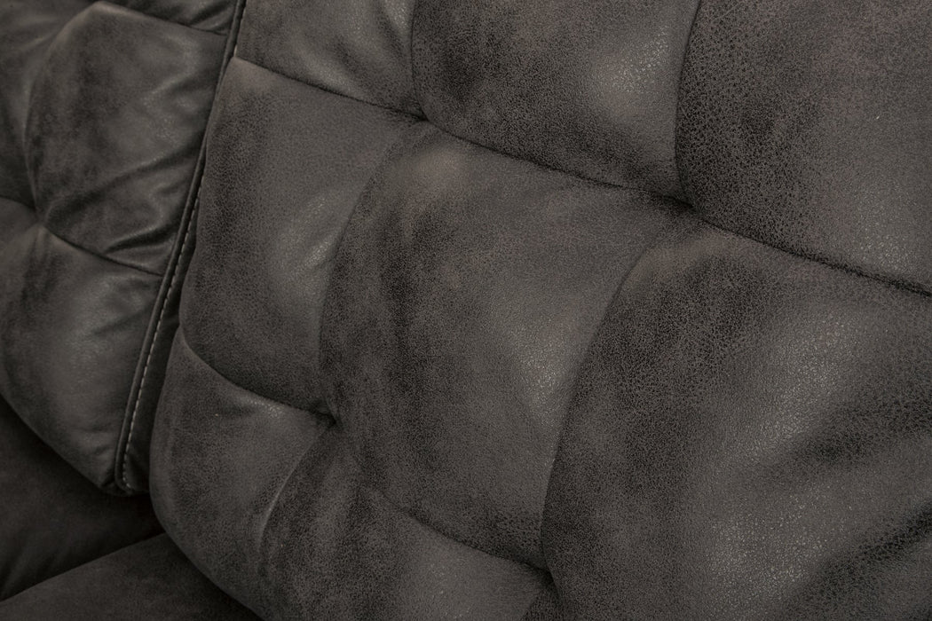This ultra-contemporary sofa chaise, chair and ottoman set invites you to kick out and make yourself comfortable. Linear track arms offer a clean, sleek aesthetic, while tufted box cushions are a nod to mid-century design. Gunmetal gray faux leather offers the cool, weathered look you love and touchably soft feel you crave. Simply flip the cushion and slide the ottoman to reverse the chaise for customized comfort.