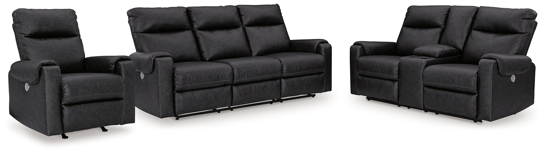 | Details | Includes power reclining sofa, power reclining loveseat with console and power recliner, Sofa with dual-sided reclining; middle seat remains stationary, One-touch power control with adjustable positions and zero-draw USB port, Zero-draw technology only consumes power when the USB receptacle is in use, Corner-blocked frame with metal reinforced seat, Attached cushions, High-resiliency foam cushions wrapped in thick poly fiber, Faux leather upholstery, Loveseat features center console with 2 cup holders and hidden storage, Recliner with gentle rocking motion, Power cord included; UL Listed | |