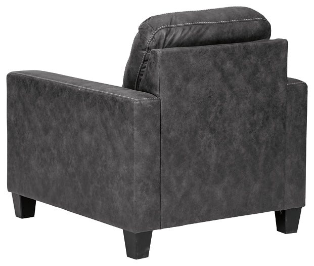 This ultra-contemporary chair invites you to kick out and make yourself comfortable. Linear track arms offer a clean, sleek aesthetic, while tufted box cushions are a nod to mid-century design. Gunmetal gray faux leather offers the cool, weathered look you love and touchably soft feel you crave.