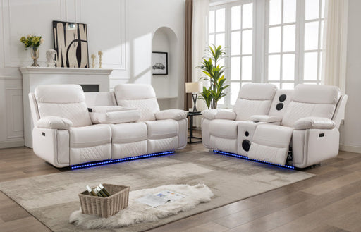 GenerationPower motion Sofa with Drop down tray with bottom LED lights. Power console Loveseat with Bluetooth bass speakers and bottom LED lights