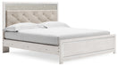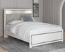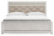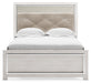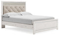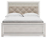 The epitome of fashion-forward design, this queen upholstered panel bed is a beautiful blend of comfort and luxury. Shiny chrome-tone accents, a pearlized finish and button-tufted upholstery bring a glam touch to the richly rustic appearance. Remote-controlled LED lighting adds style and modern conveniences to your restful retreat.