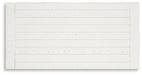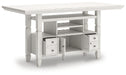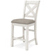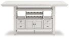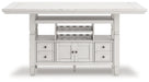 Details D642D7: Includes dining table top and base, Made with rubberwood solids, ash veneer and MDF substrates, Antiqued white finish with wood grain texture, Two 10-bottle wine storage shelves (1 reversible), Lower door cabinet accessible from both sides, 2 pass-through drawer bins, Assembly required, D642-124: Made with wood, Antiqued white finish with wood grain texture, Foam cushion with polyester upholstery, Nailhead trim, X-back, Assembly required,