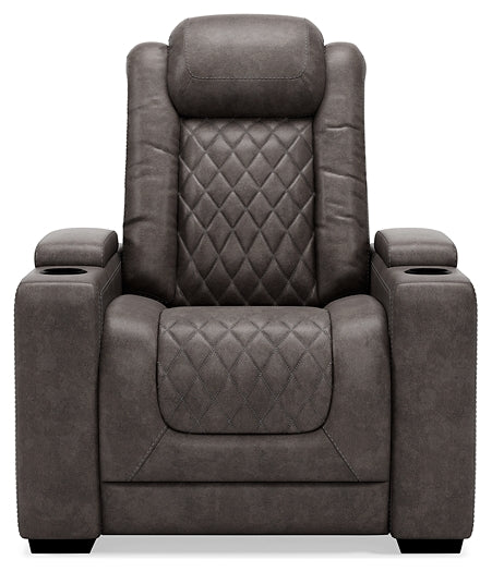 This power recliner in weathered gray is proof of just how far recliners have come when it comes to form and function. Ultra cool and contemporary, this fully loaded power recliner makes it so easy to social distance and make home your haven. Dressed to impress with diamond stitching inspired by sports car interiors, this recliner is covered in a fabulous faux leather with pebbled effect for authenticity. High-tech advancements include a one-touch power control with Easy View™ adjustable headrest and USB plug-in. Hidden storage compartments in the armrests are a welcome touch.