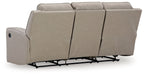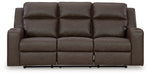 Indulge your lust for comfort and love for contemporary design with this reclining sofa. Made for easy everyday living, it’s upholstered in a heavyweight padded faux leather and accented with contrast jumbo stitching for fashion-forward flair. Sleek track arms elevate the look with a touch of modern sensibility. A drop-down table with dual cup holders and USB charging completes the experience.