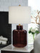 | Details | Made of glass and metal with drum hardback fabric shade, Brown finish, Metal with goldtone finish, 3-way switch, 1 E26 socket, type A bulb recommended (not included); 150 watts max or LED equivalent; UL Listed, Minor assembly required; simply attach preassembled shade to lamp base | |