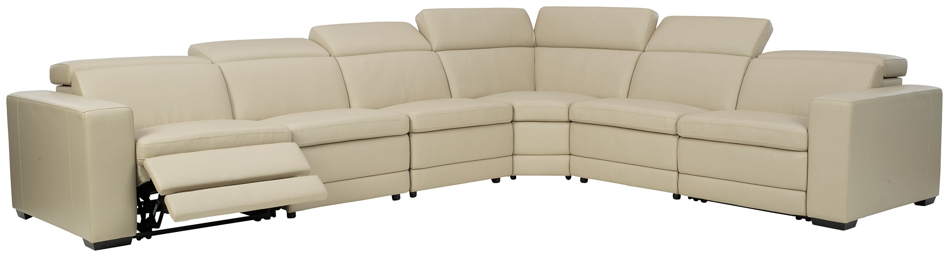 Truly putting high design into recline, this sectional with gray leather match upholstery proves that just because you’re a recliner doesn’t mean you have to look like one. Deceptively beautiful, its ultra clean-lined aesthetic is as cool and contemporary as they come. Low-profile back has a super swank look. When you need more support for your head and neck, the press of a button engages the Easy View™ power adjustable headrest, designed to let you lean back and still have a primo view of the TV. To save room, the zero wall design requires minimal space between wall and chair back.